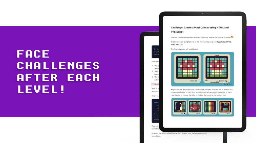 TypeScript Gamified is a coding book inspired by video games. Each chapter is a level you must conquer. Levels include a handful of topics, code samples, and pixel art graphics starring characters and other elements from different well-known video games.